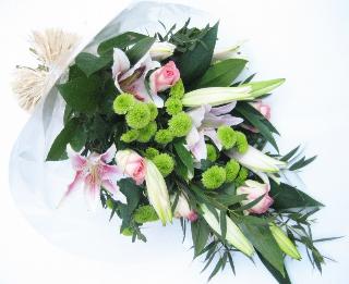 Condolence bouquet with mixed flowers, including noble flowers (roses and lilies) and greenery.