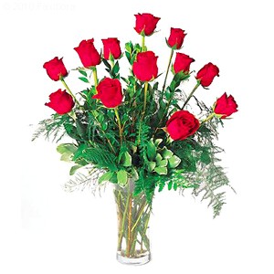 12 noble roses and foliage compose this selected flower arrangement in an elegant vase.